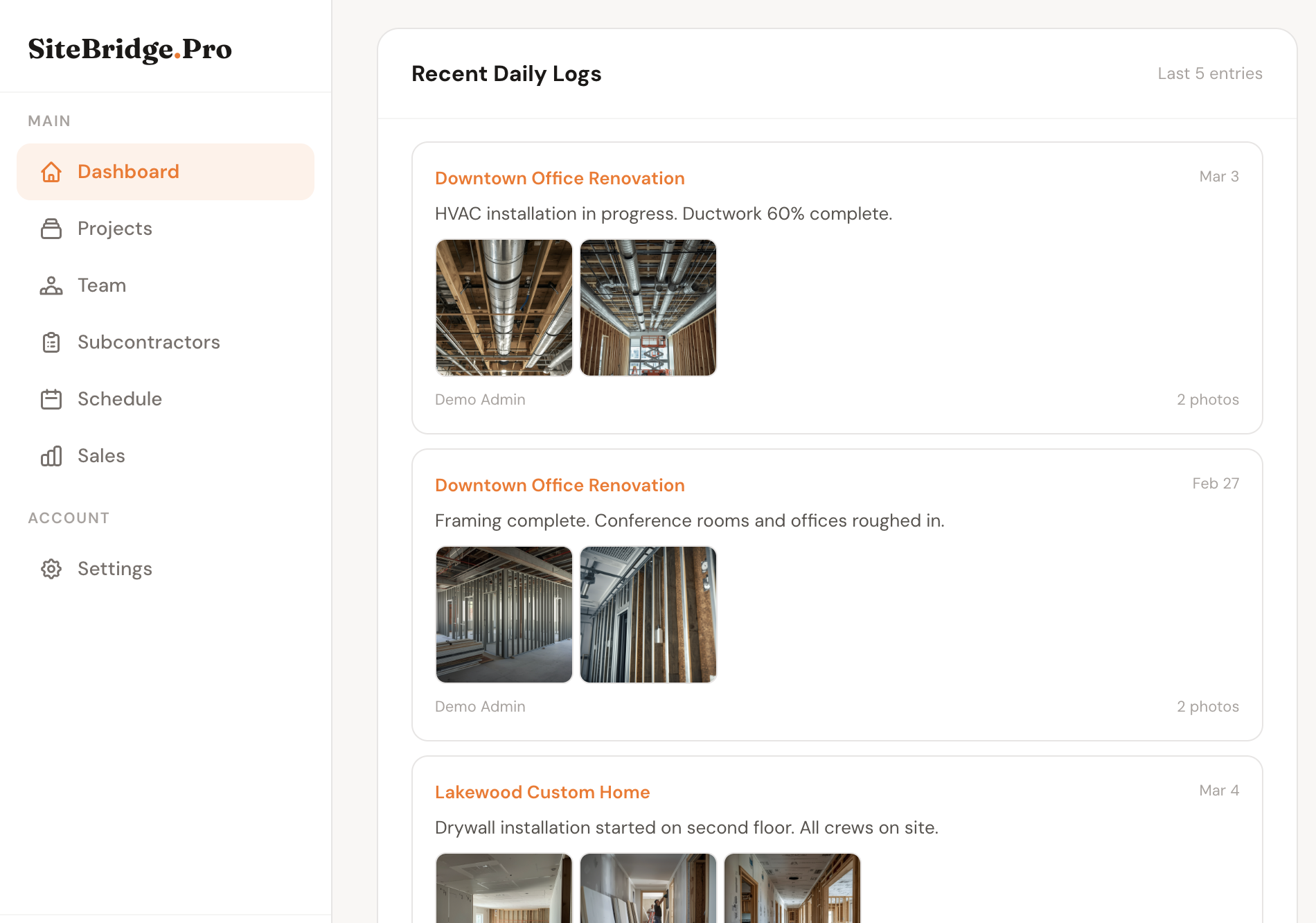 Back at the office, your dashboard shows the latest logs across all active projects. Click into any log to see the full entry, photos, and who submitted it.